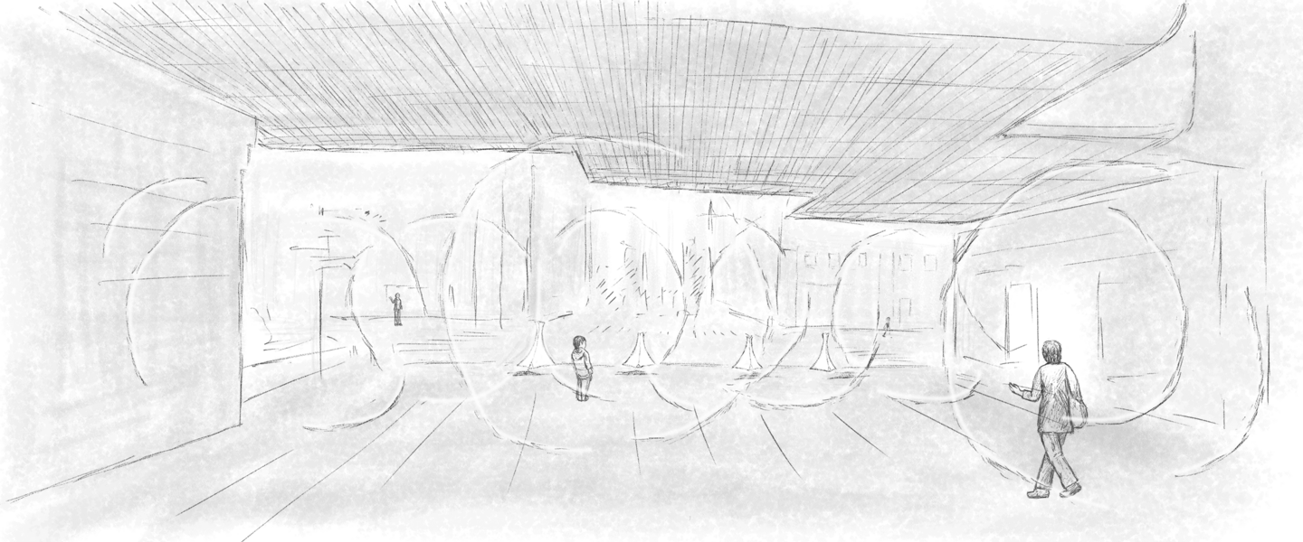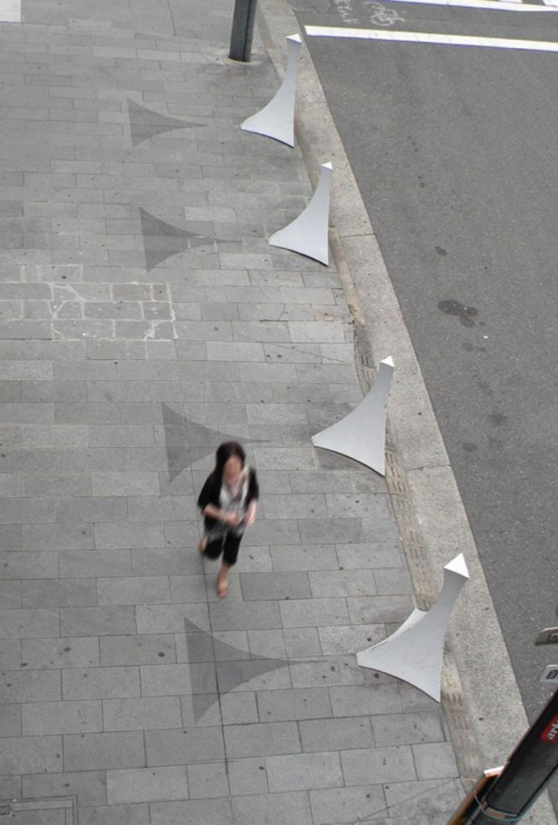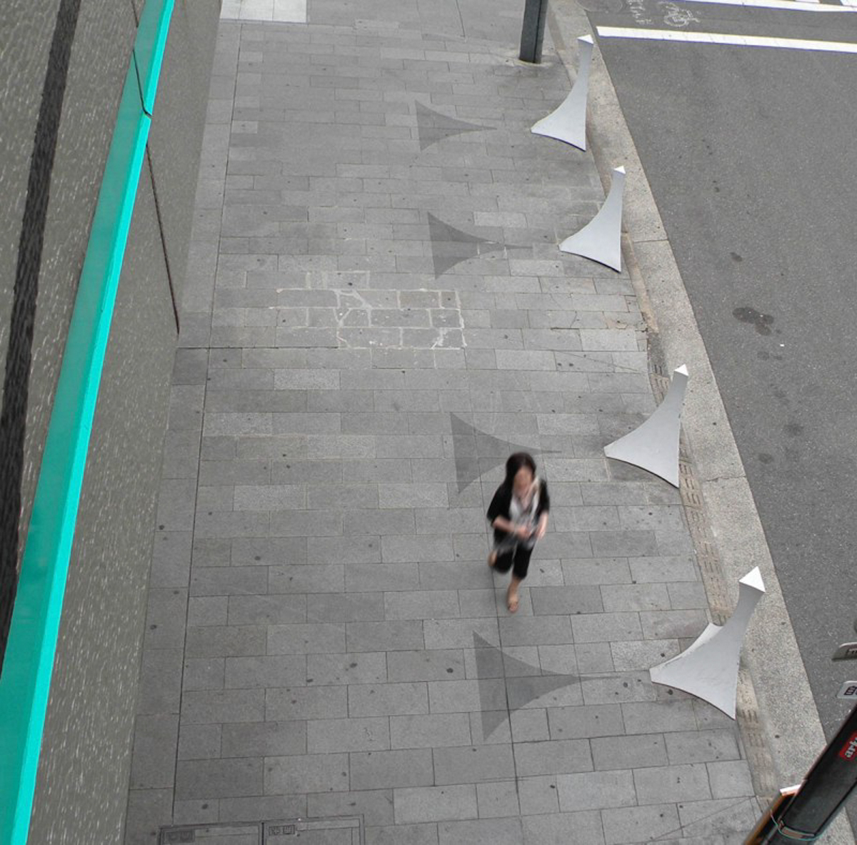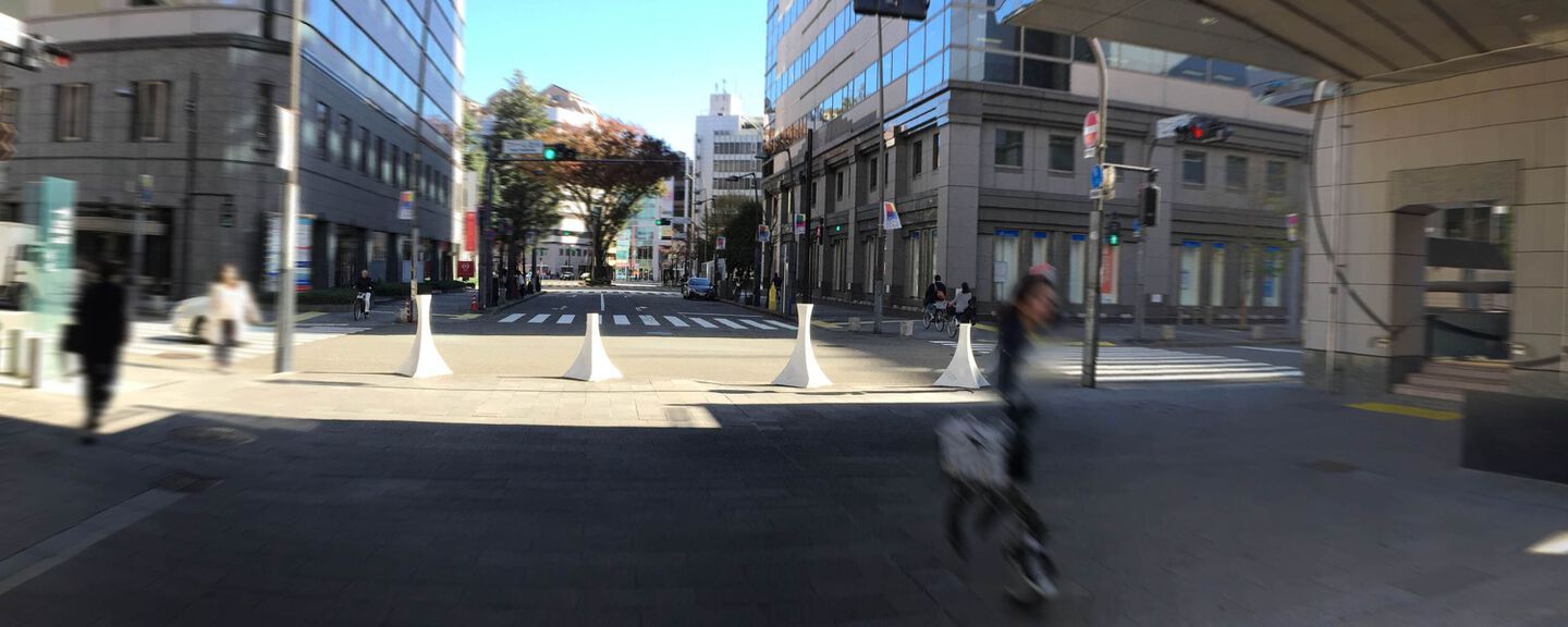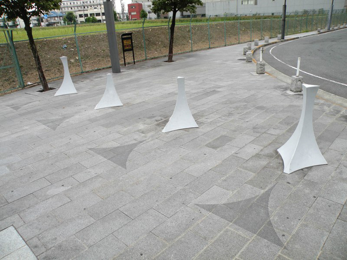 都市には、人々の間の慣習や様々な社会機構が網の目のように潜在していますが、これはその現れの一つである「車止め」の「心理的な機能」を形にしたもの。 人の固有空間として知覚体験される大きさの“球空間”を表す球面の断片立体と舗装の模様によって、車の空間性から 人の空間性へと変化させる「場」を作り出す。