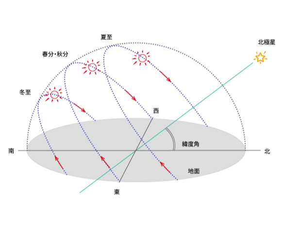 そのため、同じ太陽をそれぞれ違った角度から見ているので、日の出から南中・日没を見ている時間の違いや、日射量の違いなど、様々な差異が生じている。