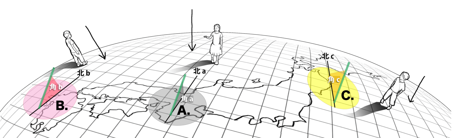 各地面と太陽との関係がそれぞれの現地と同じ状態になるようにそのままの角度で重ね合わせ、