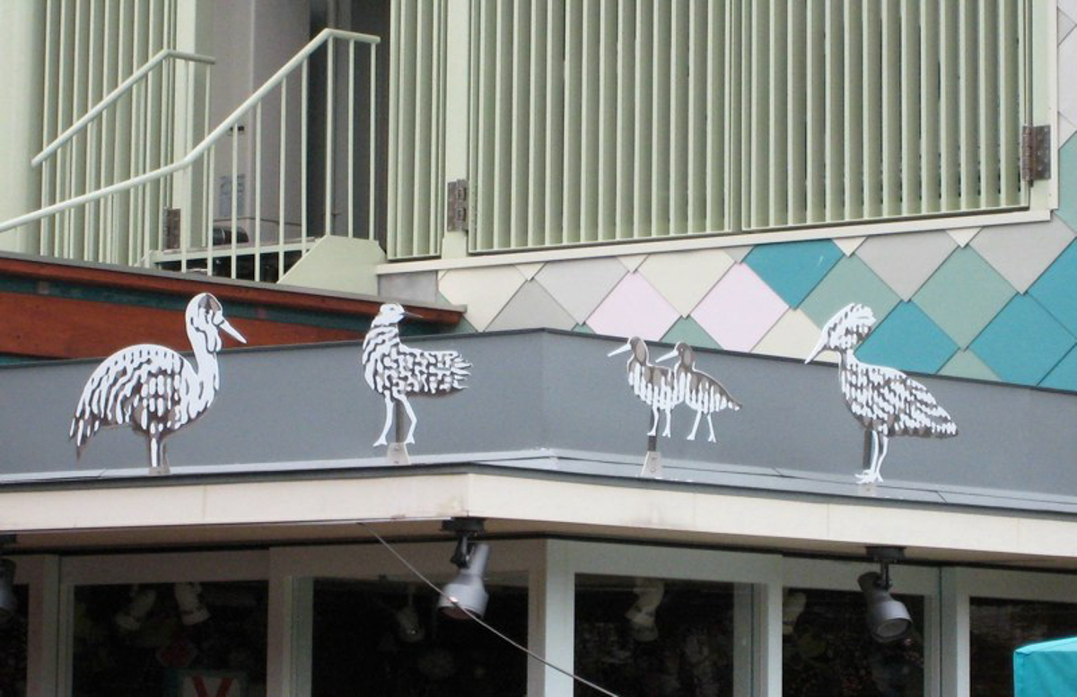 昭和の懐かしさが今だに人気の、上野動物園鳥類エリアの休憩所・売店施設などの景観リニューアル。 象設計集団による建築物における、外壁ファサードやサイン看板などによる環境グラフィック。 その場所自体がもともと持っている空間性を、深く再構成・造形し直すことで、昔からずっとそこにあったかのようでいて、新しく独特で個性的なものに。 売店正面 既成塗装鋼板を一枚一枚、映像のドットの様に配置。 サインモチーフは、ここを取りまく周囲で飼われている鳥たち 鳥たちが森の中に飛び立つかの様に この場所に元々あった色合いを分析し 馴染みながら 浮き出るような 文字たちも鳥たちと一緒になって囀り、踊る。 左からホオカザリヅル・エリマキシギ・ミヤコドリ・シュモクドリ ステンレスエッチングに塗装:見る角度によってキラキラと光り方が変わる 桜や藤が満開になると、混在していたピンクが華やかに広がる。 一年後、手前にあった機械室もグラフィック塗装することに 隣接する藤棚とも一体となった場所性を作る。 売店サインのモチーフを紋様にして展開、空間を広げる。 左からシロハラハイイロエボシドリ・カンムリシギダチョウ・ケリ・・・