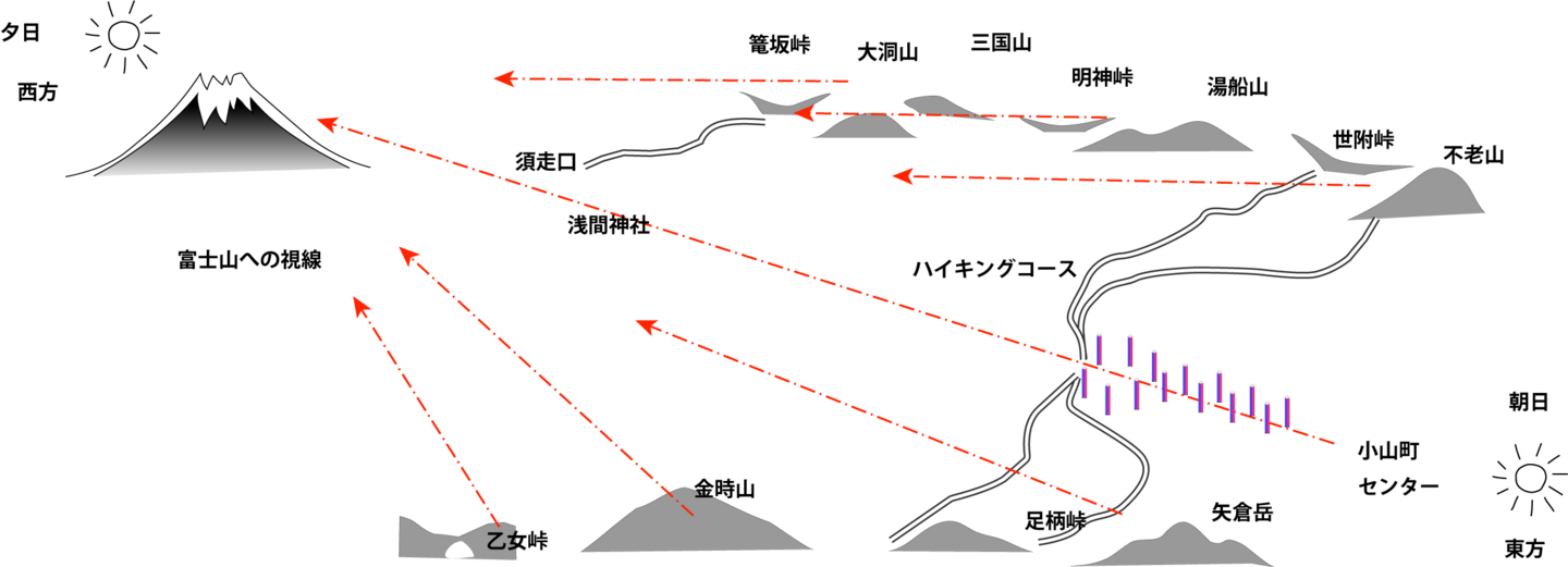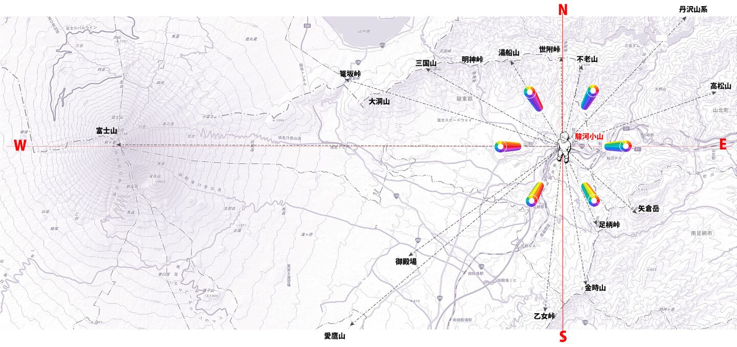 周囲に富士山を始めいくつもの「山」や「峠」が点在している谷間の施設のアプローチ。山は霞みやすくまた手前の丘に邪魔されて見えないときも多い。ここに埋め込まれた地名は、円柱がその配色に見える方向にその地点があることを示している。この広場内を歩き回って、これらの地点がその配色の方向にあることを意識のなかで結びつけながら知覚体験できる。
